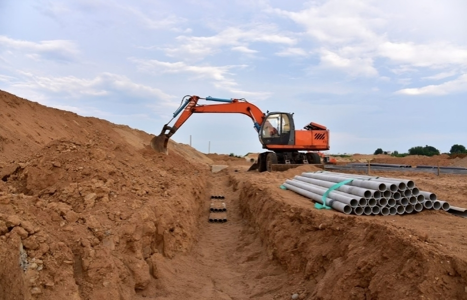 Trenching for water lines, electrical conduits, and stormwater systems.